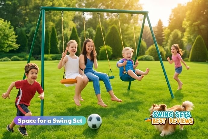 Finally, the material and design of the swing set matter. Wooden sets often take up more room than slim metal ones, and modular sets with towers and bridges need more clearance.